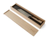 -Wert, Messgröße für die Härte des Stahls, liegt bei 61. VG-10 ist ein Edelstahl und enthält im Unterschied zu den Kohlenstoffstählen Aogami oder Shirogami ca. 15% Chrom. Die Ummantelung besteht aus 16 Lagen härterem und 18 etwas weicherem Nickel Damast. So dass Härte, Schärfe und die sinnvolle Elastizität in einem hervorragenden Verhältnis zueinanderstehen. Finish: Optisch wird die Klinge einerseits durch die Damast Lagen, andererseits – im oberen Bereich – durch das Hammering dominiert. Bevor die Klinge gehämmert wird, bearbeitet Yoshimi die Klingen-Oberfläche mit einem besonders feinen Schliff. In Test hat sich herausgestellt, dass der eckige, besondere Stil des Hammerings den Antihaft-Effekt für Schnittgut sehr gut unterstützt. Griff: Der Griff dieser Messer ist aus hochwertigem, seltenem