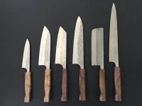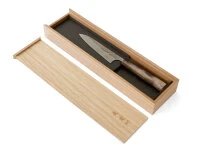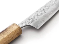 -Wert, Messgröße für die Härte des Stahls, liegt bei 61. VG-10 ist ein Edelstahl und enthält im Unterschied zu den Kohlenstoffstählen Aogami oder Shirogami ca. 15% Chrom. Die Ummantelung besteht aus 16 Lagen härterem und 18 etwas weicherem Nickel Damast. So dass Härte, Schärfe und die sinnvolle Elastizität in einem hervorragenden Verhältnis zueinanderstehen. Finish: Optisch wird die Klinge einerseits durch die Damast Lagen, andererseits – im oberen Bereich – durch das Hammering dominiert. Bevor die Klinge gehämmert wird, bearbeitet Yoshimi die Klingen-Oberfläche mit einem besonders feinen Schliff. In Test hat sich herausgestellt, dass der eckige, besondere Stil des Hammerings den Antihaft-Effekt für Schnittgut sehr gut unterstützt. Griff: Der Griff dieser Messer ist aus hochwertigem, seltenem