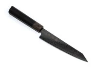 übertrifft dieser japanische Stahl von Hitachi Metalls die meisten Edelstähle. VG-10 ist zu einem der am meisten verwendeten Edelstähle in Japan für Damastmesser geworden und zeichnet sich besonders durch seine Härte, Schnitthaltigkeit und Korrosionsbeständigkeit aus. Ummantelt sind die Messerklingen mit 32 Lagen Damast in 32 Lagen. Die Griffe der Saiun Messerserie bestehen aus schwarzem Micarta, harzimprägniertes Holz mit Leinen. Dieses Material ist sehr unempfindlich, langlebig, wasserabweisend und pflegeleicht. Für den Schliff sind die Messer von Kanetsugu bekannt. Alle Saiun Messer sind leicht konvex geschliffen, was den Klingen Stabilität, Haltbarkeit und ein überaus angenehmes Schneidverhalten gibt. Dieser Schliff leitete die Kanetsugu Cutlery aus den traditionellen japanischen Schwertern ab, die der Schwertschmied Kanetsugu bereits im 14’ten Jahrhundert schmiedete.
