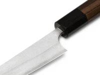 Material: Der blaue Papierstahl ist und bleibt der beliebteste Messerstahl in Japan. Er ist verschleißfester als Shirogami, damit noch schnitthaltiger, bietet eine extrem hohe Härte und ein begeisterndes Schärfepotential. Aogami super ist der Stahl unter den blauen Papierstählen mit den besten Eigenschaften und kann mit etwas Übung so scharf geschliffen werden, wie kaum ein anderer Stahl – rasiermesserscharf. Die Messerserie Nashiji von Yoshimi Kato ist mit Aogami super und einer Außenhaut (Ummantelung), fein säuberlich vom Meister Yoshimi Kato, Sohn von Hiroshi Kato, selbst „feuerpoliert“ geschmiedet. Der Stahl der Ummantelung und das Finish Nashiji sehen nicht nur sehr gut aus, sie schützen auch vor Rost, ohne nach europäischem Maßstab rostfrei zu sein. Bei einer üblichen und sorgfältigen Behandlung ist ein Rostbefall nahezu ausgeschlossen. Die ungetrübte Freude an diesem Messer kann ein Leben lang dauern. Finish: Nashiji, oder auch Pear Skin Finish, ist eine japanische Spezialität. Funktional bietet es einen zusätzlichen Schutz der feinen Klinge und erleichtert die Schneidarbeit durch verringertes Haften des Schnittgutes. Hauchdünne Filets vom Fisch oder Fleisch, feine Scheiben von Gurken, Tomaten oder Zwiebeln haben fast keine Chance an der Klinge zu haften. Optisch ist es für Liebhaber ein echter Leckerbissen, japanische Messer mit diesem Finish sind sehr gefragt. Die gepunktete Struktur und der feine Satin-Schimmer geben dem Messer einen ganz eigenen Charme und Charakter. Griff: Die Messer Griffe der Nashiji Serie sind 8-eckig ausgeführt, sehr griffig und rutschfest. Das