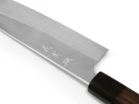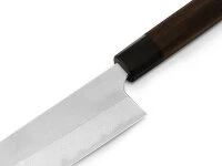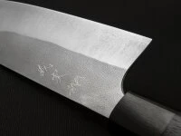 Material: Der blaue Papierstahl ist und bleibt der beliebteste Messerstahl in Japan. Er ist verschleißfester als Shirogami, damit noch schnitthaltiger, bietet eine extrem hohe Härte und ein begeisterndes Schärfepotential. Aogami super kann mit etwas Übung so scharf geschliffen werden, wie kaum ein anderer Stahl – rasiermesserscharf. Die Messerserie Nashiji von Yoshimi Kato ist mit Aogami super und einer Außenhaut (Ummantelung), fein säuberlich vom Meister Yoshimi Kato, Sohn von Hiroshi Kato, selbst „feuerpoliert“ geschmiedet. Der Stahl der Ummantelung und das Finish Nashiji sehen nicht nur sehr gut aus, sie schützen auch vor Rost, ohne nach europäischem Maßstab rostfrei zu sein. Bei einer üblichen und sorgfältigen Behandlung ist ein Rostbefall nahezu ausgeschlossen. Die ungetrübte Freude an diesem Messer kann ein Leben lang dauern. Finish: Nashiji, oder auch Pear Skin Finish, ist eine japanische Spezialität. Funktional bietet es einen zusätzlichen Schutz der feinen Klinge und erleichtert die Schneidarbeit durch verringertes Haften des Schnittgutes. Hauchdünne Filets vom Fisch oder Fleisch, feine Scheiben von Gurken, Tomaten oder Zwiebeln haben fast keine Chance an der Klinge zu haften. Optisch ist es für Liebhaber ein echter Leckerbissen, japanische Messer mit diesem Finish sind sehr gefragt. Die gepunktete Struktur und der feine Satin-Schimmer geben dem Messer einen ganz eigenen Charme und Charakter. Griff: Die Messer Griffe der Nashiji Serie sind 8-eckig ausgeführt, sehr griffig und rutschfest. Das