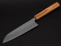 . Finish: Die Minamo-Serie hat eine Klinge mit 3 Lagen und einem ausgesprochen schönen Hammering, das die Optik der Klinge dominiert. Bevor die Klinge gehämmert wird, bearbeitet Yoshimi die Klingen-Oberfläche mit einem besonders feinen Schliff. Griff: Diese Serie bieten wir mit zwei unterschiedlichen Griffen an. Ein Griff ist aus italienischem Olivenholz, gewachst und achteckig (Oktagon) geformt. Der zweite Griff ist aus dunkler Wenge. oktagon. Beide Griffe vermitteln eine großartige Haptik und liegend hervorragend in der Hand.